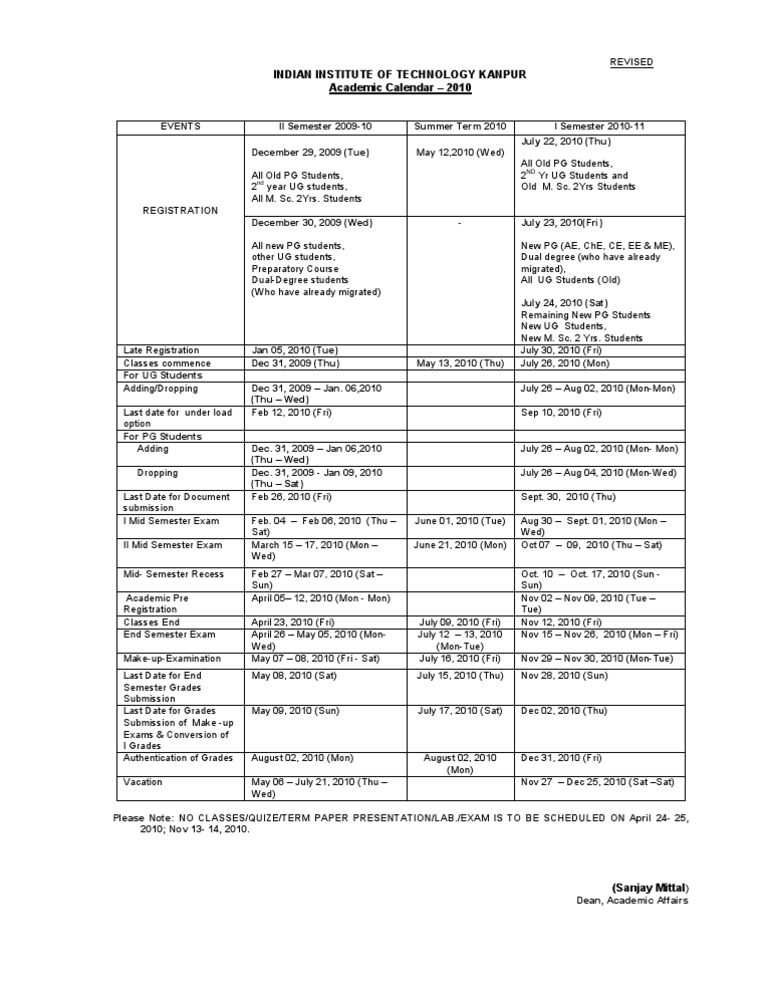 AcademicCalendar2010 IIT Kanpur Academic Term Academia