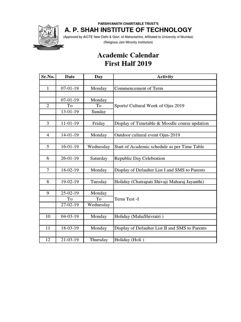 Academic Calender FirstHalf2019 PDF Academic Term Observances