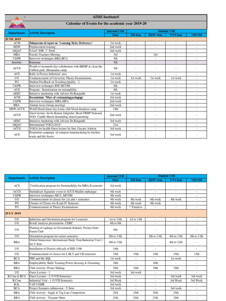 Aims Institutes Calendar of Events For The Academic Year 201920 PDF