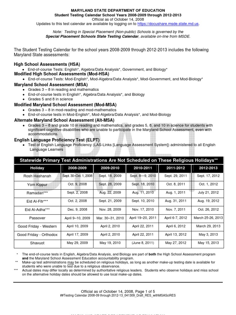 The Student Testing Calendar For The School Years 20082009 Through
