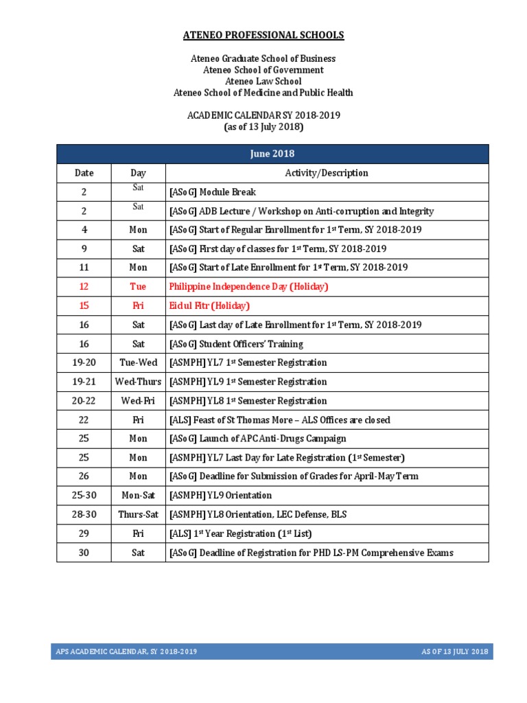 Aps Academic Calendar Sy 20182019 (As of 13 July 2018) 1 PDF