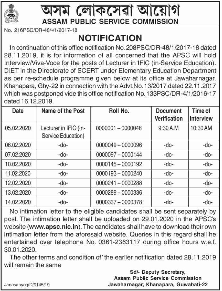 APSC Admit Card 2020Interview Schedule For Lecturer In DIET Released