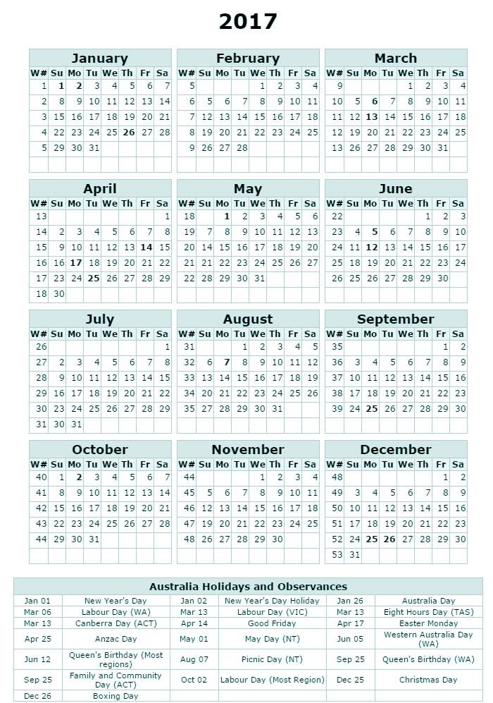 Free Printable Calendar 2018 Australia 2017 Calendar with holidays