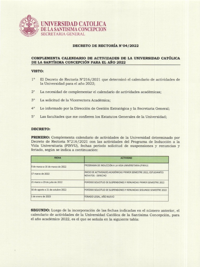 Calendario de Actividades Académicas Ucsc 2022 PDF Estudiantes