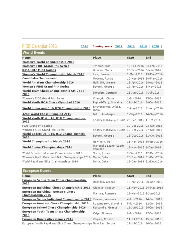 FIDE Calendar 2016 PDF Chess Olympiads Games Of Mental Skill