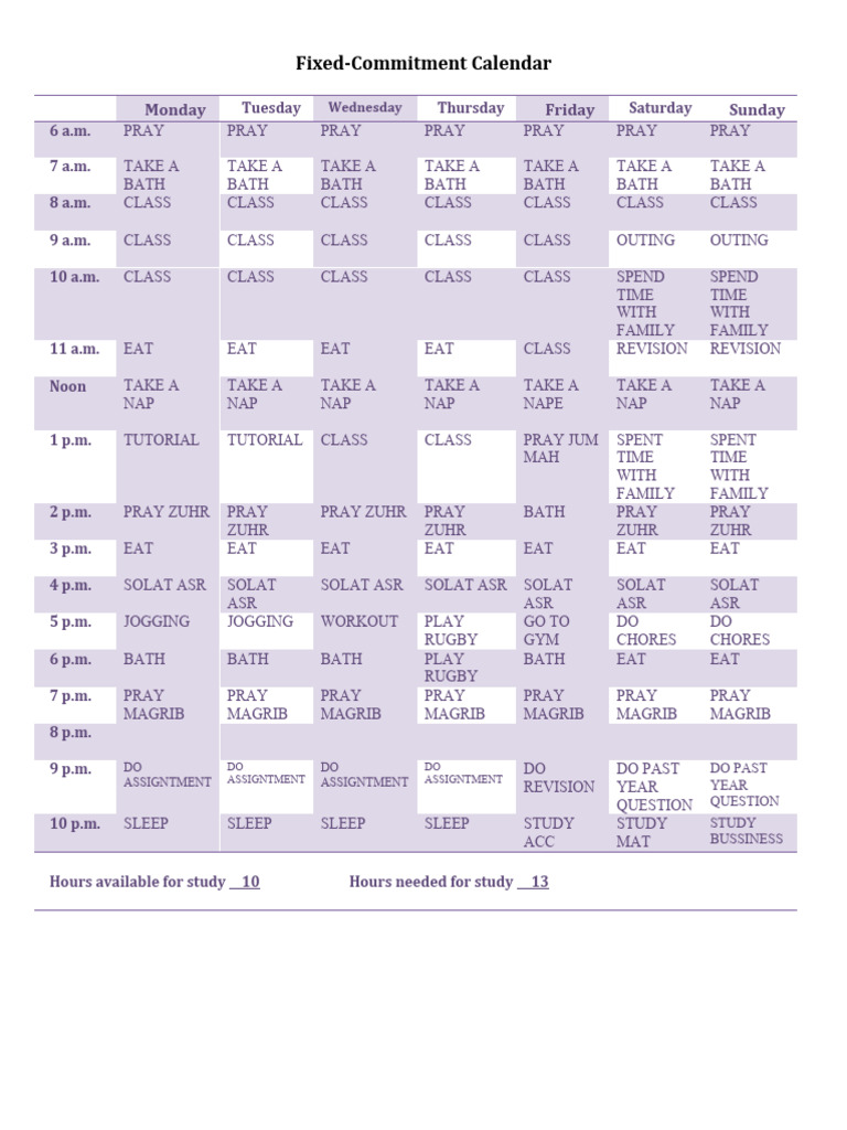Plan your fixed commitment and study schedule. Praying praying praying praying praying praying praying. Create a fixed commitment calendar and post an image of it.