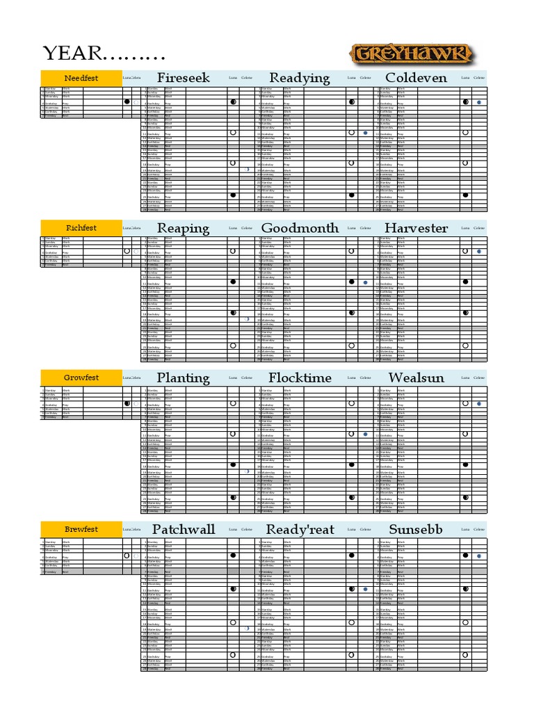 Web this section describes the major annual events commonly recognized in the central flanaess, particularly the domain of greyhawk, focusing on the four festival weeks of the calendar year and certain days of importance to the functioning of the government of the city of greyhawk. It is the most common system for tracking the days and months of the common year in the flanaess. Maybe this might inspire you to make your own calendars. The greyhawk year consists of 364 days, split into twelve.