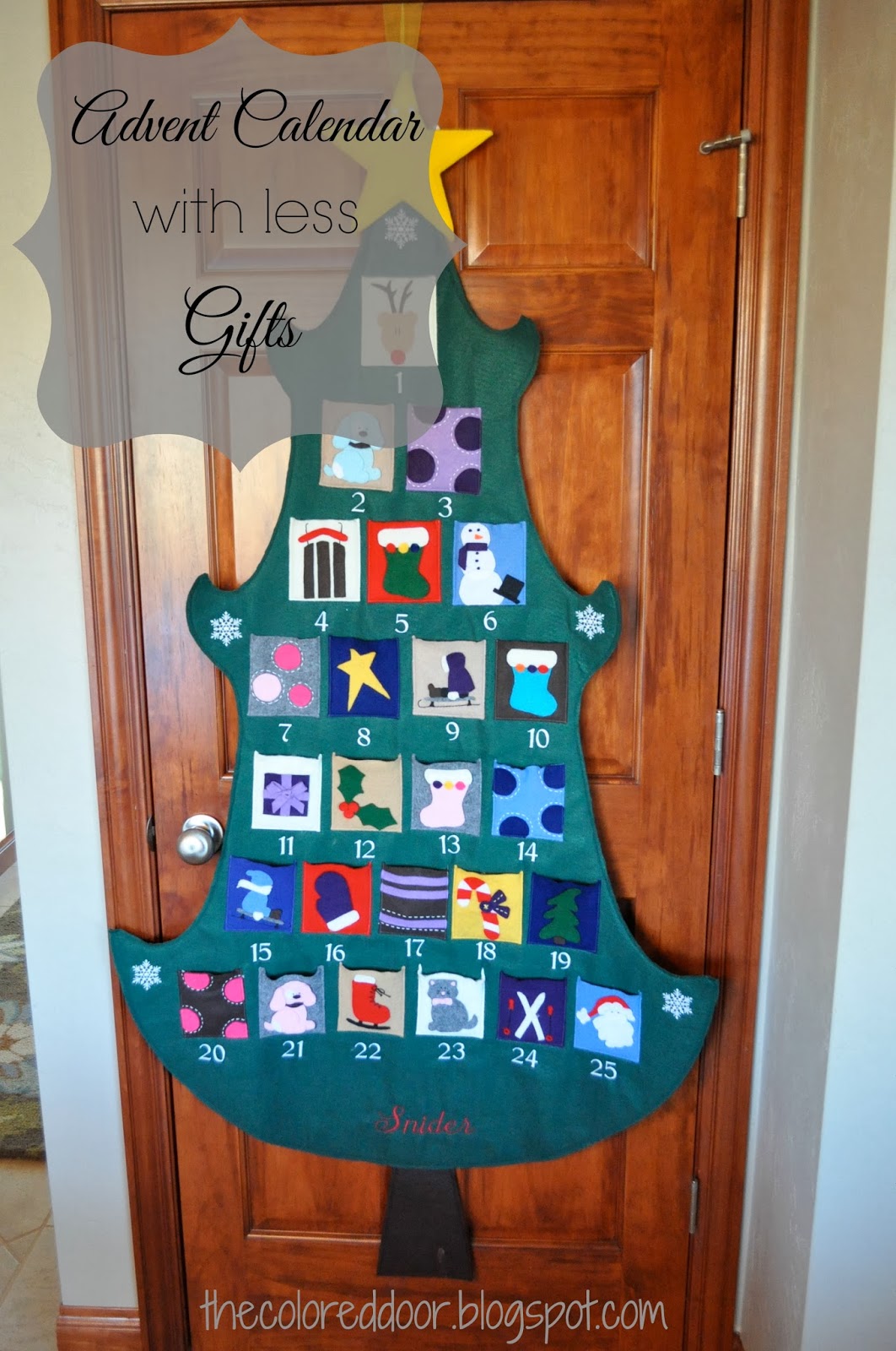 the colored door Advent Calendar with Less Gifts (aka Junk)