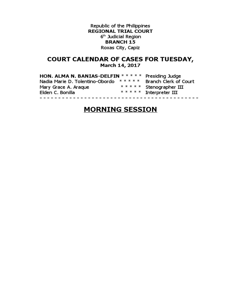 Court Calendar of Cases For Tuesday, Morning Session PDF