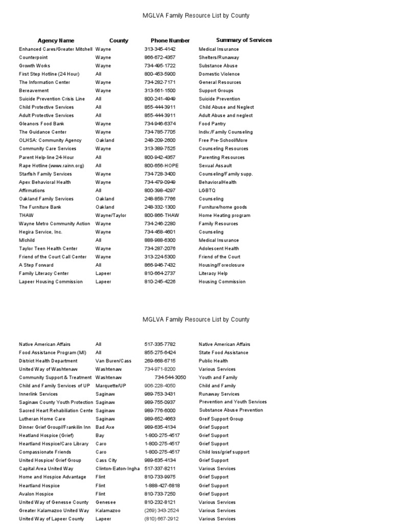 mglva family resource list by county Child Abuse Michigan