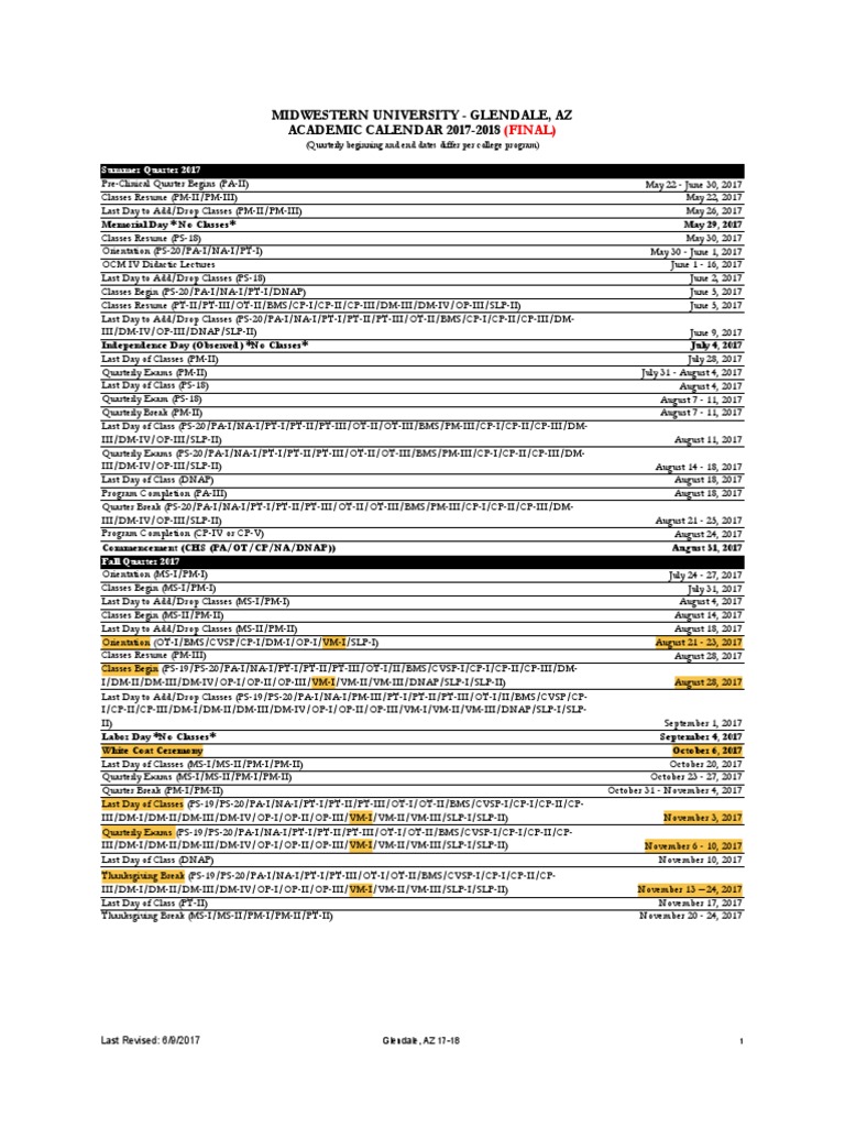 Midwestern University Glendale, Az ACADEMIC CALENDAR 20172018 PDF