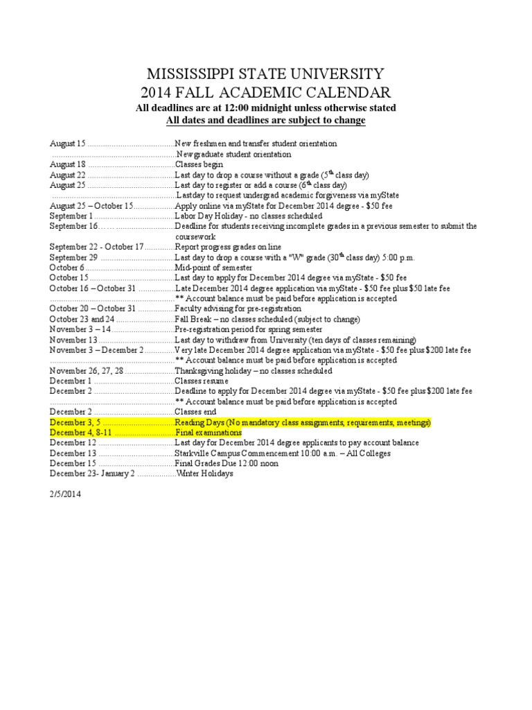 Mississippi State University 2014 Fall Academic Calendar PDF