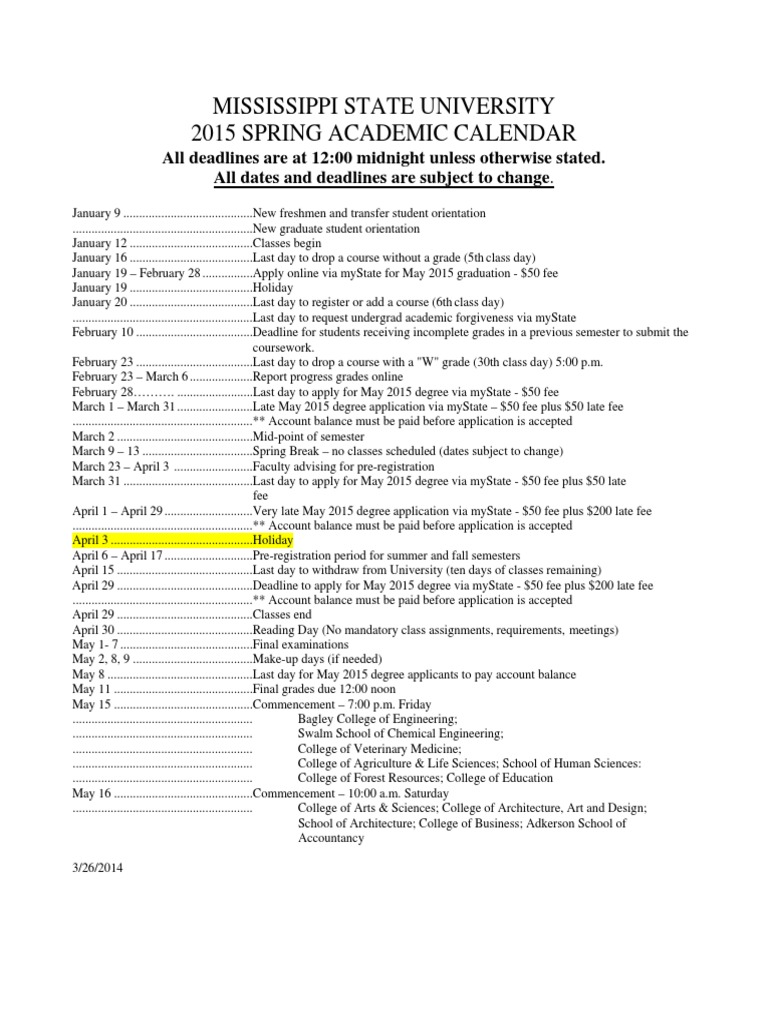 Mississippi State University 2015 Spring Academic Calendar PDF
