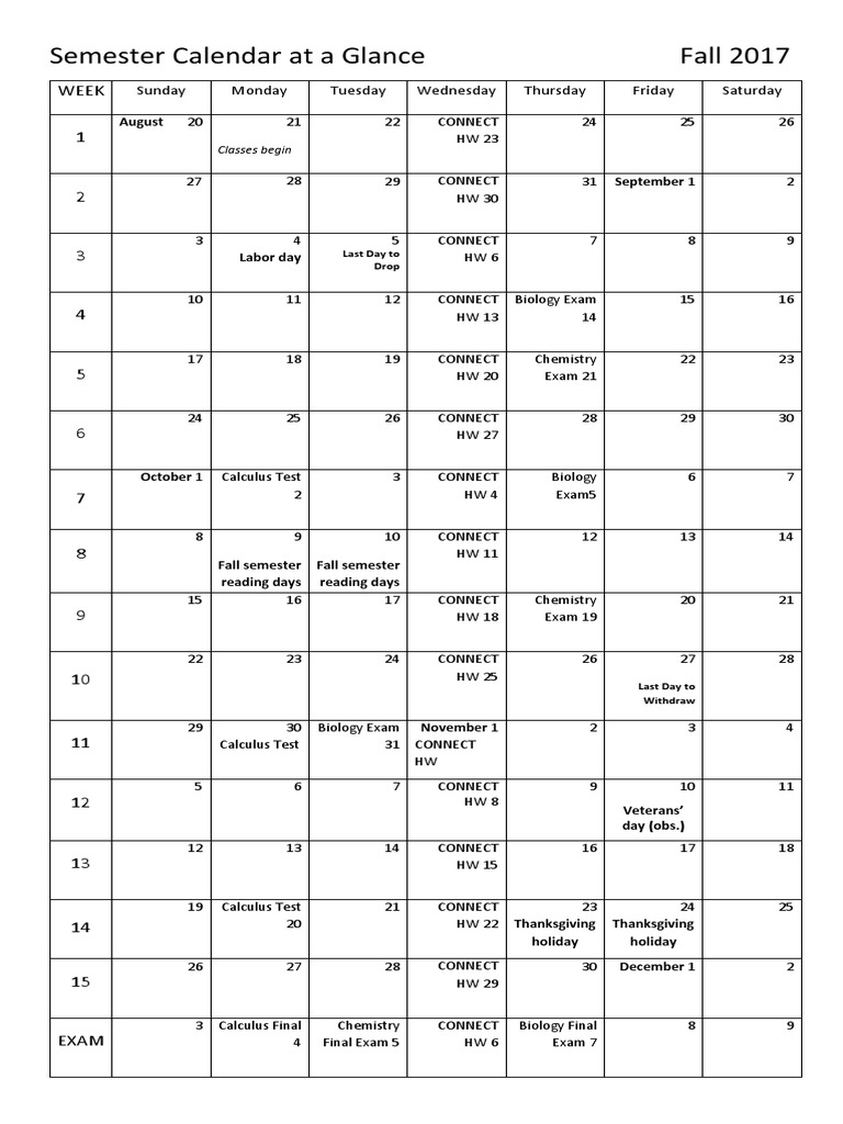 Semester Calendar Fall 2017 PDF Academic Term Holidays