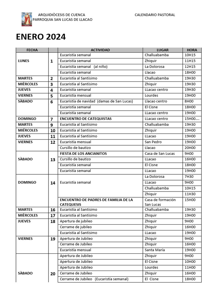Calendario Enero 2024Signed PDF eucaristía La gente de Nazaret