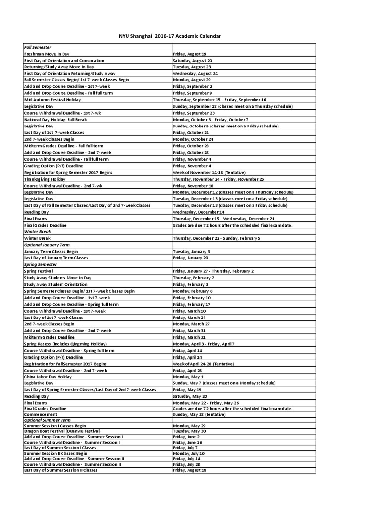 201617 Academic Calendar NYU Shanghai PDF Academic Term Schools