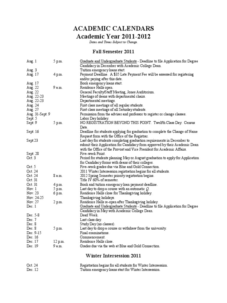 Academic Calendars Academic Year 20112012 Fall Semester 2011 PDF