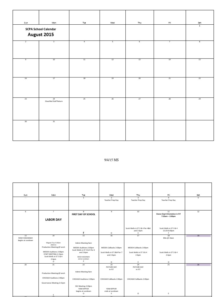 August 2015 SCPA School Calendar PDF Holidays Observances