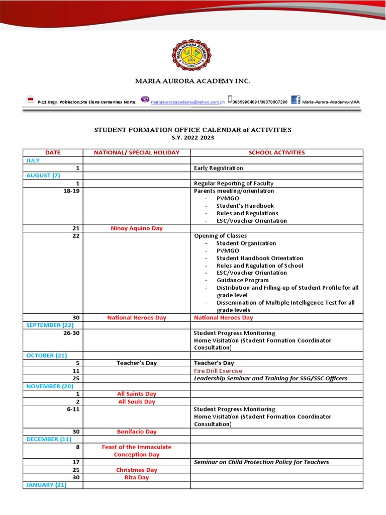 SFC CALENDAR OF ACTIVITIES 20222023 PDF
