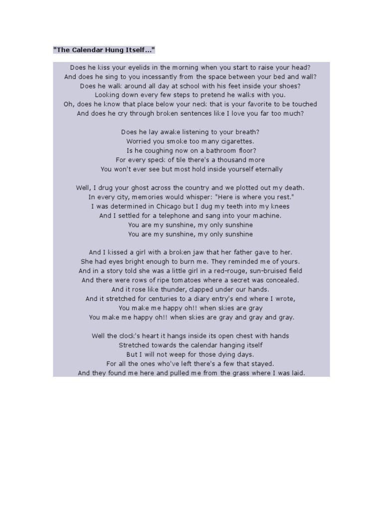 Web original lyrics of the calendar hung itself song by bright eyes. And does he sing to you incessantly from the place between your bed and wall? Does he kiss your eyelids in the morning / when you start to raise your head? Fevers and mirrors this is not a love story.
