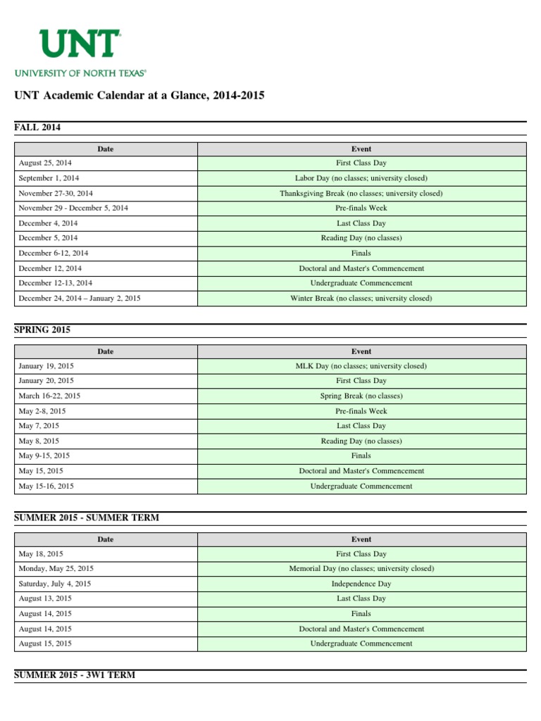 UNT Academic Calendar at A Glance, 20142015 FALL 2014 PDF