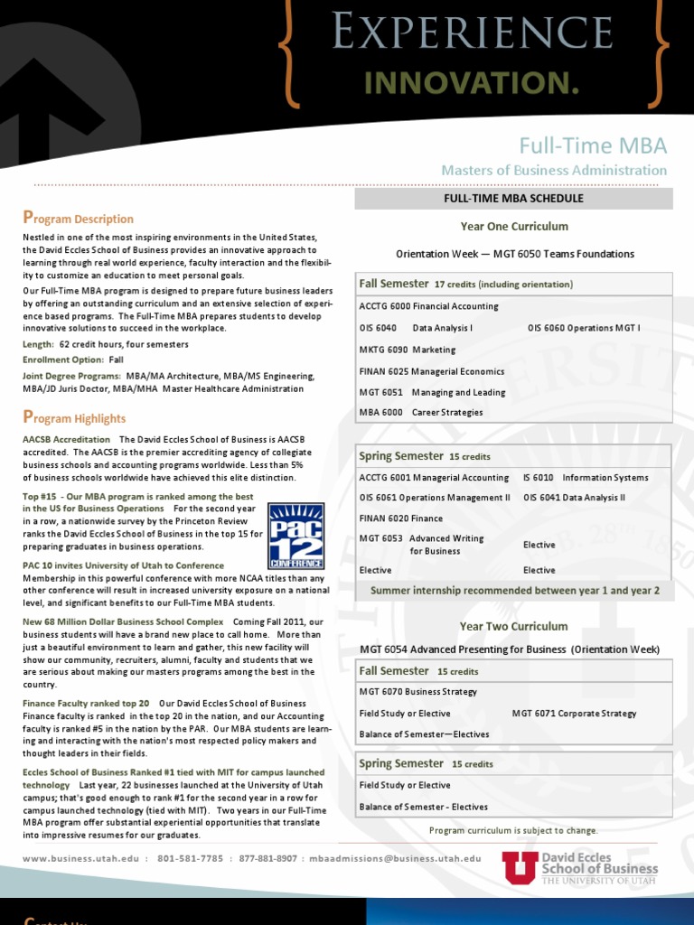 UofU FullTime MBA Info Sheet Master Of Business Administration